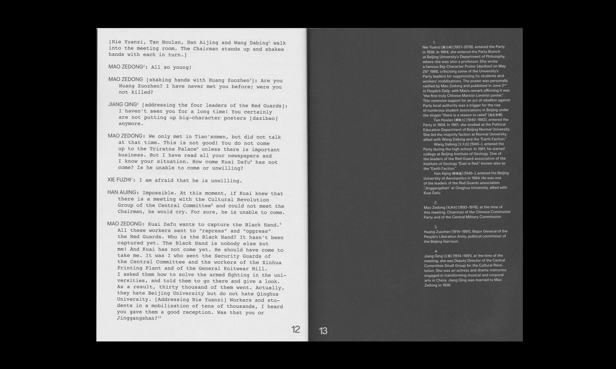 Both the foreword and afterword to the document are written by Alessandro Russo, a theoretician and sinologist, whose work on the Cultural Revolution has given a fresh philosophical perspective for grasping the subjective dimension of this antagonistic episode in modern politics. By discussing the document as a ‘script’ for a stage performance, Russo claims that the artistic approaches, rather than the supposed classical socio-historical scholarly wisdom, are better qualified to “look at the document as deeply subjective, that is, as intrinsically political.”